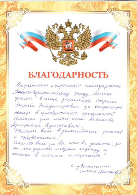 Мы просто уверены, что благодаря Вам, наши отзывчивые Волшебники, жизнь Адильжана станет намного проще и комфортнее!!! От всего сердца благодарим всех Вас за неимоверную поддержку и помощь! Спасибо,что Вы есть у нас. Дай бог здоровья крепкого Вам и вашим семьям, благополучия и успехов во всём. Спасибо Вам огромное!