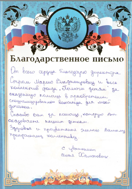 Доброе утро, дорогие друзья! В этот замечательный день мы хотим поделиться с Вами радостной новостью! Сбор для Халоповой Анастасии закрыт!!! Благотворительным Фондом "ПОМОГИ ДЕТЯМ" для Насти был приобретен специализированный велосипед. Дорогие наши помощники! Спасибо за то, что остаётесь с нами: не оставляете без внимания наши рассылки, следите за социальными сетями фонда, жертвуете и рассказываете о фонде своим знакомым! Все это было бы не возможно без Вас, дорогие наши волшебники! Спасибо Вам большое за каждую оказанную Вами помощь! Ваша поддержка и вера в наше благое дело очень много значит для нас!