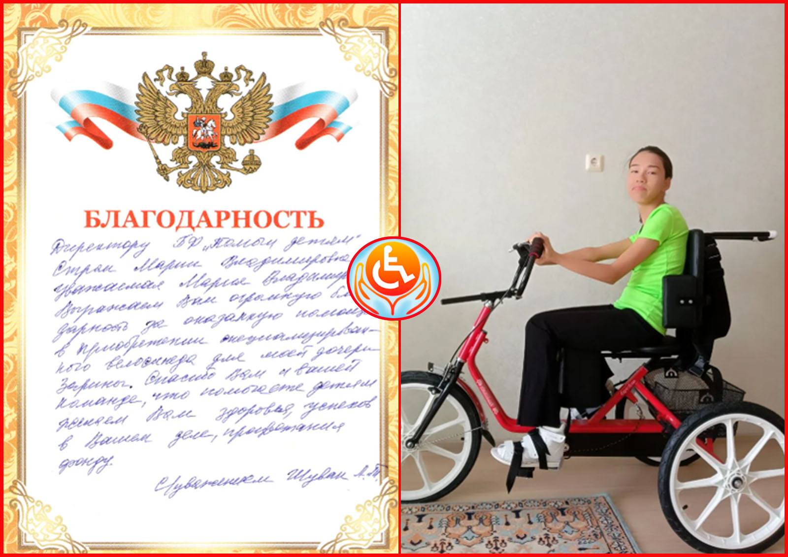 Для Сидоровой Оксаны ( г.Оренбург) был приобретен специализированный велосипед для детей с ДЦП "Велолидер" / Декабрь 2017 г.